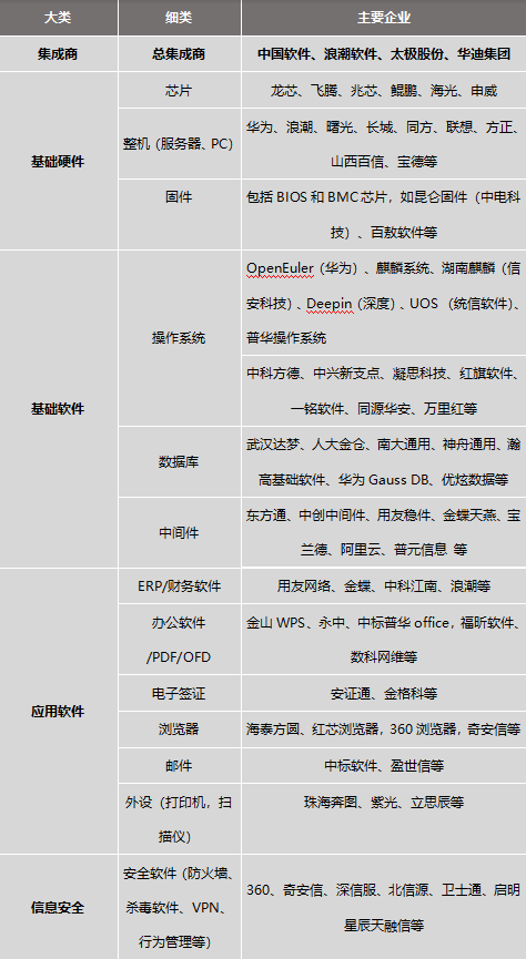 CPU 芯片、 服務器 、存儲、交換機、路由器 、各種云和相關服務內容?;A軟件:數據庫、操作系統、中間件、應用軟件、OA、ERP、辦公軟件、政務應用。信息安全、邊界安全產品、終端安全產品等。