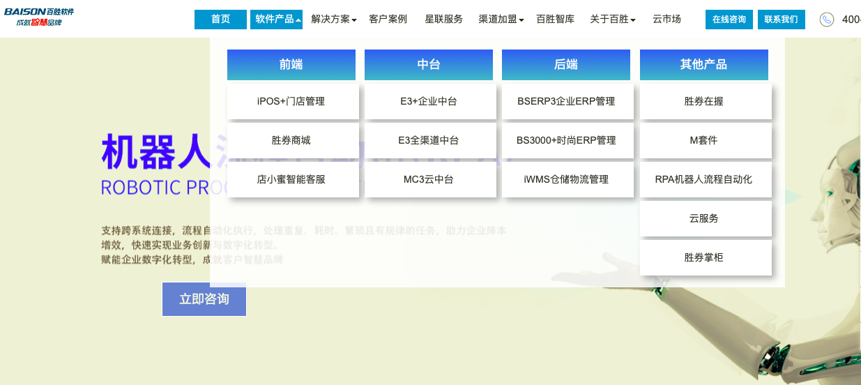 上海百勝軟件股份有限公司成立2000年,是全渠道數(shù)字零售解決方案服務(wù)商,為零售行業(yè)提供運營咨詢和數(shù)智化解決方案,業(yè)務(wù)涵蓋企業(yè)中臺、數(shù)字零售、電子商務(wù)、移動應(yīng)用、云服務(wù)、RPA&AI、大數(shù)據(jù)應(yīng)用、倉儲物流等領(lǐng)域的產(chǎn)品和服務(wù),軟件產(chǎn)品服務(wù)于服飾時尚、戶外運動、快消、消費電子、文具潮玩、家裝家居、食品生鮮、醫(yī)藥健康等八大行業(yè)企業(yè)。