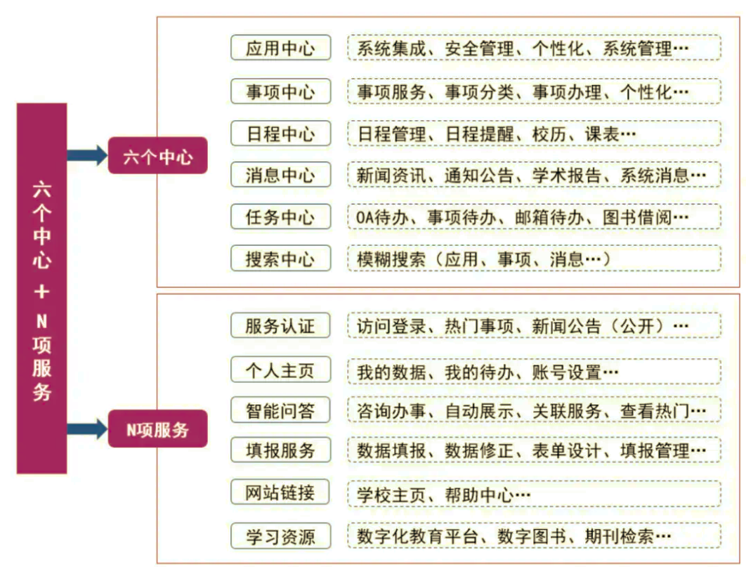 “N項服務”包括但不限于服務認證、個人主頁、智能問答、填報服務、網站鏈接、學習資源等,支持可擴展信息融合。