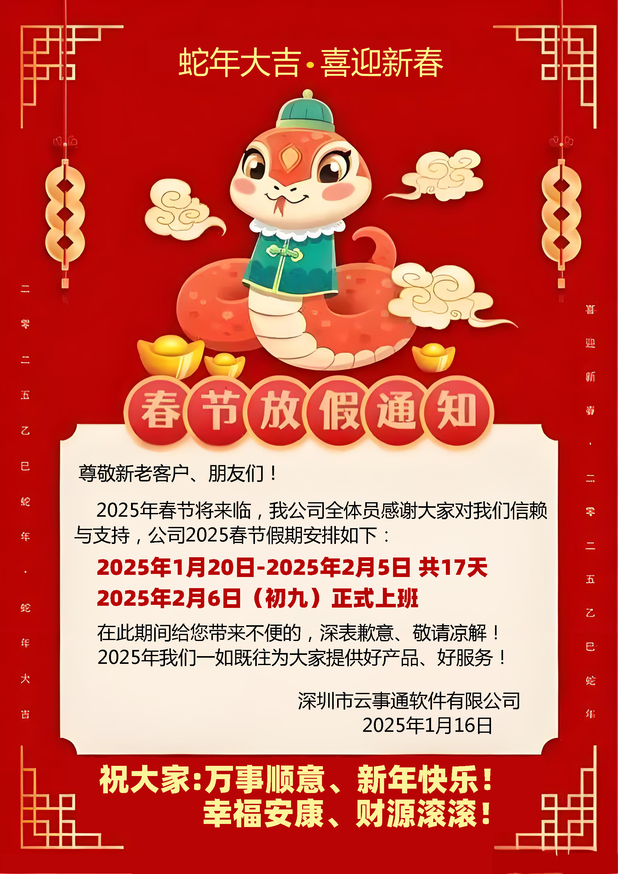 2025年云事通軟件春節放假通知2025年春節即將來臨,我公司全體員感謝大家對我們信賴與支持,公司2025春節假期安排如下:分類:公司新聞關鍵詞:春節放假通知放假通知2025年春節即將來臨,我公司全體員感謝大家對我們信賴與支持,公司2025春節假期安排如下: